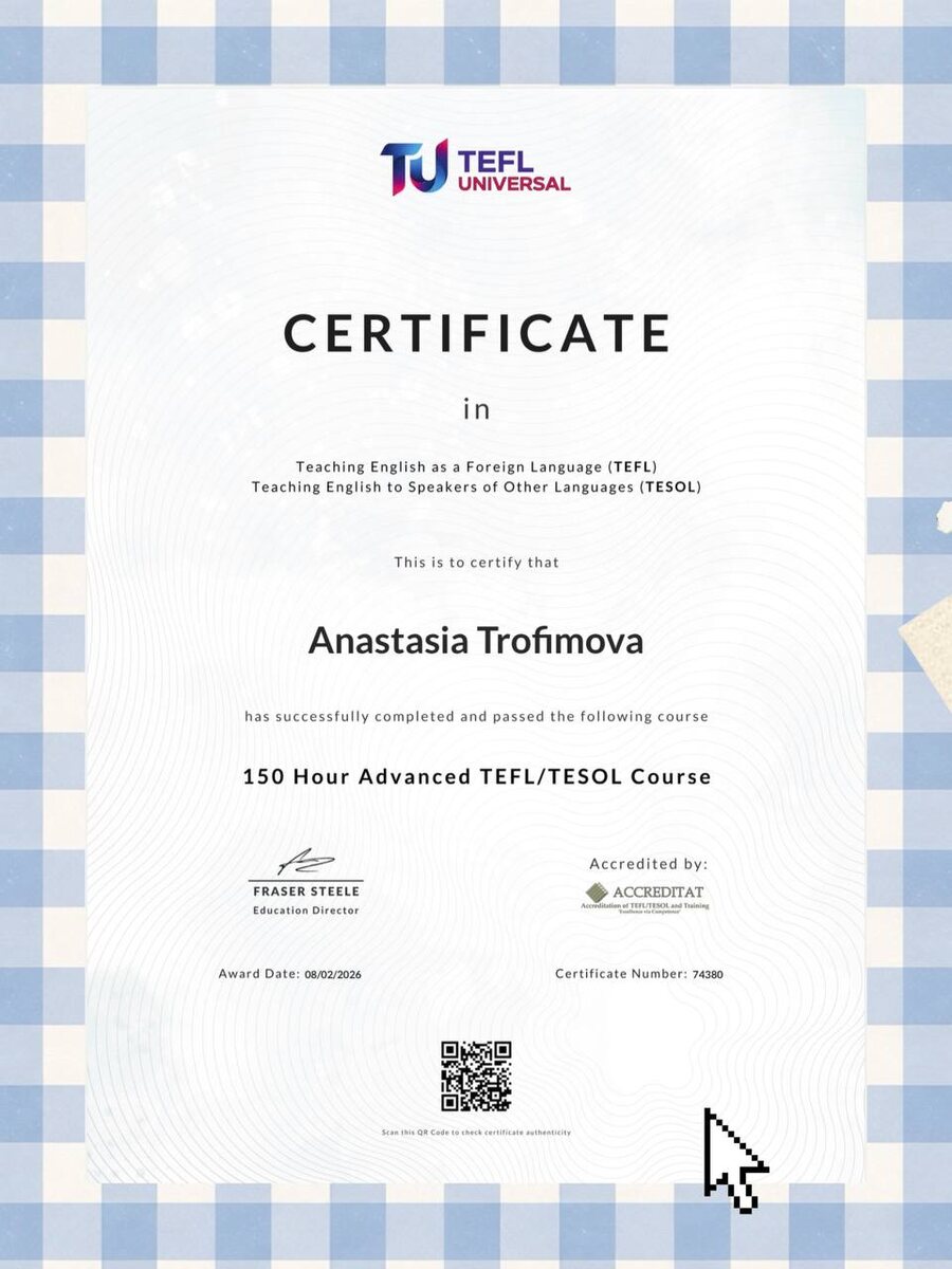 🐶 150 Hour Advanced TEFL/TESOL Course Теперь могу изменить био и дополнить свою методическую копилку 🤓💯 Давайте наберем много реакций - расскажу подробнее, что это такое, зачем мне это, как я оплачивала (это целый квест 😅), сколько и где, и в целом, было ли полезно и что я планирую делать в будущем Порадоваться за меня можно ❤️ обратной связью в комментариях! Есть кто тоже получал этот сертификат, рассказывайте, где проходили?