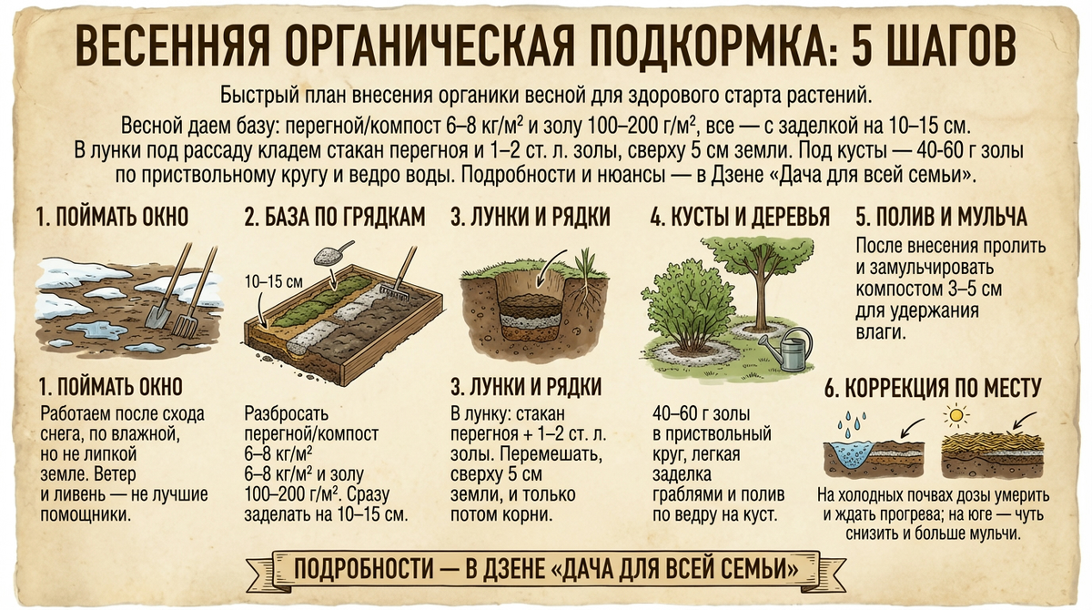 Итоги и где это все работает лучше всего. В средней полосе весенняя органическая подкормка дает ровный старт, если внести до посевов и сразу заделать. В более холодных зонах сдвигаем сроки на прогретую почву и увеличиваем долю компоста, на юге немного снижаем дозы и добавляем мульчу от жары. Граница метода проста — органика — это фундамент, минералка — настройка, а главное — не жечь корни и не оставлять удобрения на поверхности под ветром и дождем. Спокойнее работать по норме и смотреть на растение, чем спасать перекормленное. Весне по силам помочь, если не мешать ей спешкой.