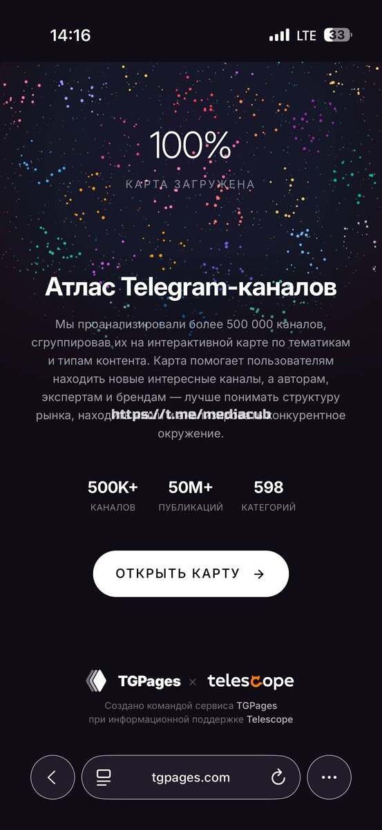 Это интерактивная ➡️ карта, отображающая более полмиллиона публичных каналов. Имеется поиск, что удобно, а также нажав на интересующий канал, можно увидеть инфу о канале, подписчиков и т.д.