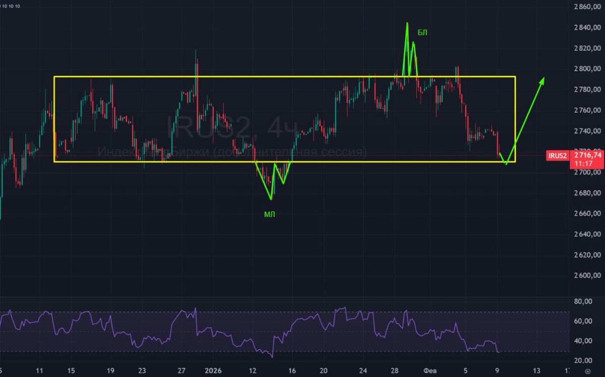 🏦 Индекс Мосбиржи 🟢 в прошлом посте про индекс, я его ждал на 2720. И мы до сих пор вблизи этой цифры. Сегодня в рынке видна слабость, все активно продают, кроме Лукойла! Напомню, в Лукойле был замечен покупатель в пятницу. 🟢 Подходим к нижней границе боковика. Ранее в этом боковике была и медвежья ловушка (выделил зеленым) и бычья ловушка (выделил красным). Тут на нижней границе может быть что угодно, но развал рынка я не жду, так что лонги не покидаю. Единственное, что я сделал - это избавился в воскресенье от ВТБ. о чем сообщил. Сегодня ВТБ делает уже -3%. 🚗 Не смотря на слабость рынка, понимаю, что скатываться вниз ему особо нет причин, так что жду сегодня-завтра откуп вверх. А так же активно слежу за Лукойлом. #индекс #индексмосбиржи #ммвб #irus #mxi #mix #imoexf #bogdanoffinvest $IMOEXF $MMM6 $MMH6 $MXH6 $MXM6