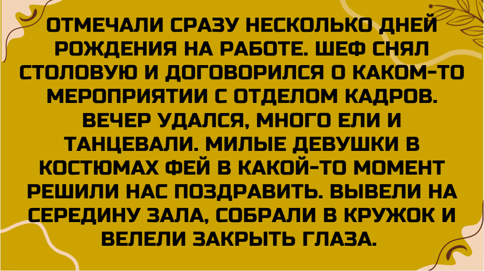 - Отмечали сразу несколько дней рождения на работе. Шеф снял столовую и договорился о каком-то мероприятии с отделом кадров. Вечер удался, много ели и танцевали. Милые девушки в костюмах фей в какой-то момент решили нас поздравить. Вывели на середину зала, собрали в кружок и велели закрыть глаза. Стою я с закрытыми глазами и чувствую, что мне в руки что-то дают, а что именно — непонятно. Тут фея, размахивая волшебной палочкой, говорит:
