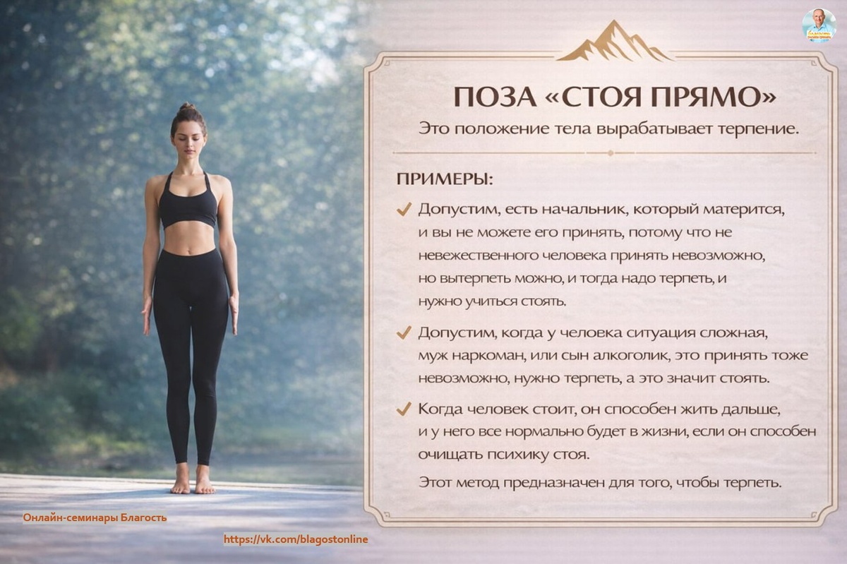 ” Это положение тела вырабатывает терпение. Когда человека стоит, он способен жить дальше, и у него все нормально будет в жизни, если он способен очищать психику стоя. Этот метод предназначен для того, чтобы терпеть.