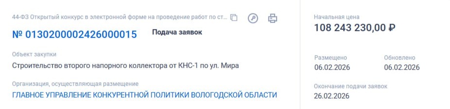 Соответствующие контракты опубликовали на сайте Госзакупок. Работы будут проводить на улицах Мира и Петина. Строить второй напорный коллектор от КНС-1 по ул. Мира, согласно документам, начнут с 26 марта этого года. Завершить все работы должны до 15 июня. Минимальная цена контракта — более 108 миллионов рублей. По улице Петина тоже будут монтировать второй напорный коллектор от КНС-13. Строительство должны начать 25 марта этого года и завершить 6 июня. Всего планируют направить более 120 миллионов рублей. Источник финансирования: Бюджет Вологодской области (в том числе бюджетные кредиты, предоставляемые из федерального бюджета бюджету субъекта Российской Федерации), бюджет города Вологды, средства Заказчика. Заказчиком выступает "Вологдагорводоканал". Telegram | ВКонтакте | Rutube | Одноклассники | Дзен