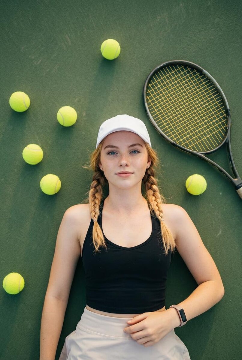 Модель: Nano Banana Сгенерировать🪄 КРИТИЧЕСКИ ВАЖНО: Сохранение внешности ОБЯЗАТЕЛЬНО сохранить все черты лица с загруженных фотографий: Точная форма лица, пропорции Черты глаз, носа, губ, бровей Индивидуальные особенности внешности Тон кожи и текстура Перенести внешность человека с фото без изменений Композиция и ракурс Формат: вертикальный портрет Ракурс: вид сверху (top-down view) Объект: девушка лежит на теннисном корте Одежда и аксессуары Чёрный спортивный топ Светлая теннисная юбка Белая бейсболка Фитнес-браслет на запястье Причёска Заплетены в две косички Спортивный инвентарь Теннисная ракетка с жёлтой струной (рядом с девушкой) Несколько ярко-жёлтых теннисных мячей Детальная текстура струн ракетки Локация Зелёный теннисный корт Детальная текстура покрытия корта Реалистичная фактура поверхности Освещение и атмосфера Естественное мягкое дневное освещение Тонкие естественные тени Тёплые тона Кинематографическая цветокоррекция Технические параметры