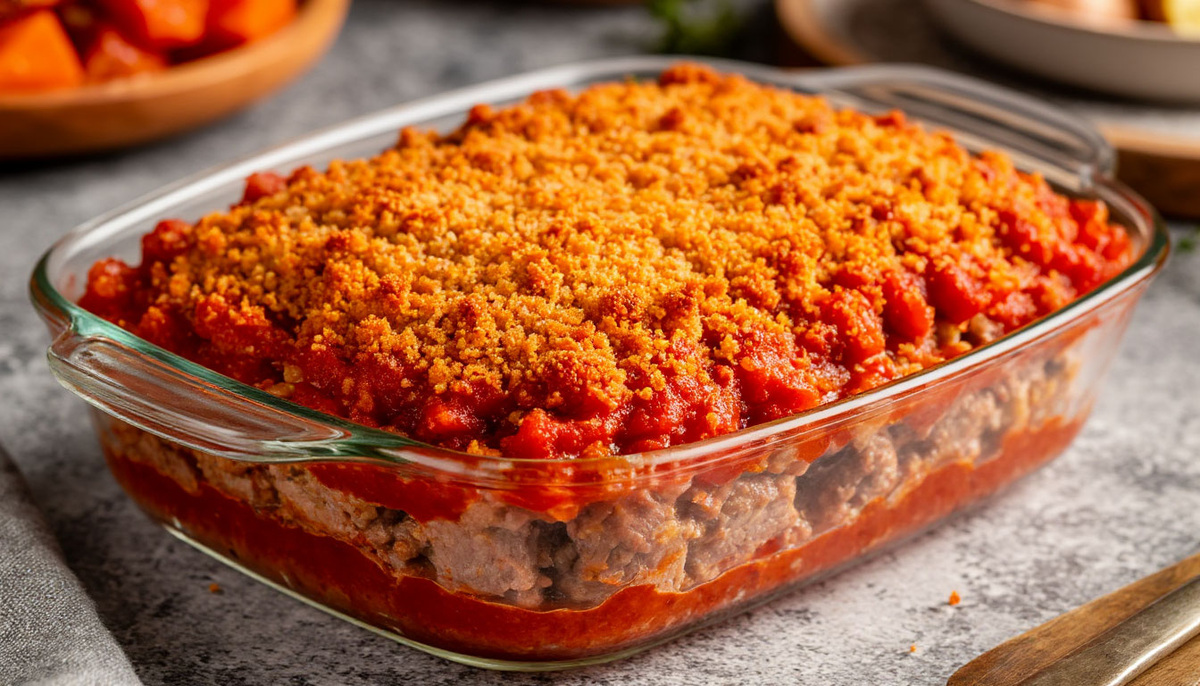 - Финальный штрих: Равномерно полейте запеканку томатным соусом. Посыпьте сверху панировочными сухарями для образования аппетитной корочки.