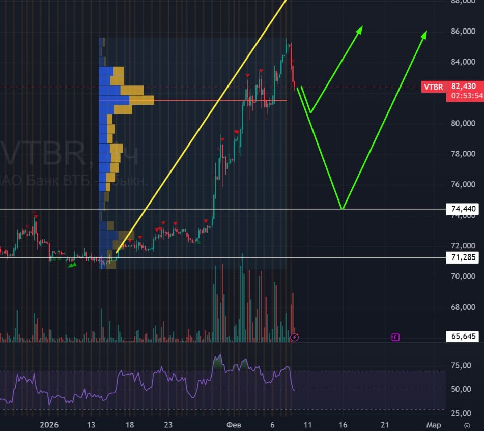 🏦 ВТБ 🟢В субботу и воскресенье в акциях ВТБ был существенный рост. Без причины, без новостей. Этот факт послужил причиной выхода из лонга. Сегодня уже откатываем сильнее чем рынок в среднем. 🟢Весь вопрос в том, что будет с ВТБ дальше? Так как я жду российский рынок вверх среднесрочно, то и ВТБ в этой перспективе буду ждать вверх.Поэтому нужно определить точку входа: их я вижу в двух местах - либо на поедании ликвидности, которая находится чуть ниже, либо на тесте накопления. 🚗 Жду локально ВТБ ниже, после чего буду ждать разгон ВТБ вверх на закрытие гэпа. #втб #vtbr #bogdanoffinvest $VTBR $VBH6 $VBM6