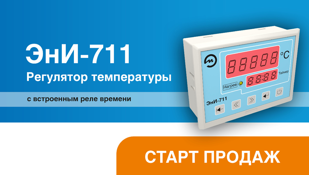 Компания «Энергия-Источник» объявляет старт продаж регулятора температуры со встроенным реле времени ЭнИ-711 Регуляторы предназначены для измерения температуры и управления нагревательным элементом с целью поддержания заданной температуры в системах автоматического регулирования, где требуется поддержание заданной температуры в течение определенного времени, например, в печах прокалки сварочных электродов или хлебопекарных печах. Ключевые технические особенности регулятора: Регуляторы температуры ЭнИ-711 разработаны в качестве импортозамещающего аналога зарубежных моделей. Служба техподдержки ответит на Ваши вопросы по использованию данных устройств. Обращайтесь по телефону +7 (351) 239-11-01 доб. 3 или по почте - support@en-i.ru.