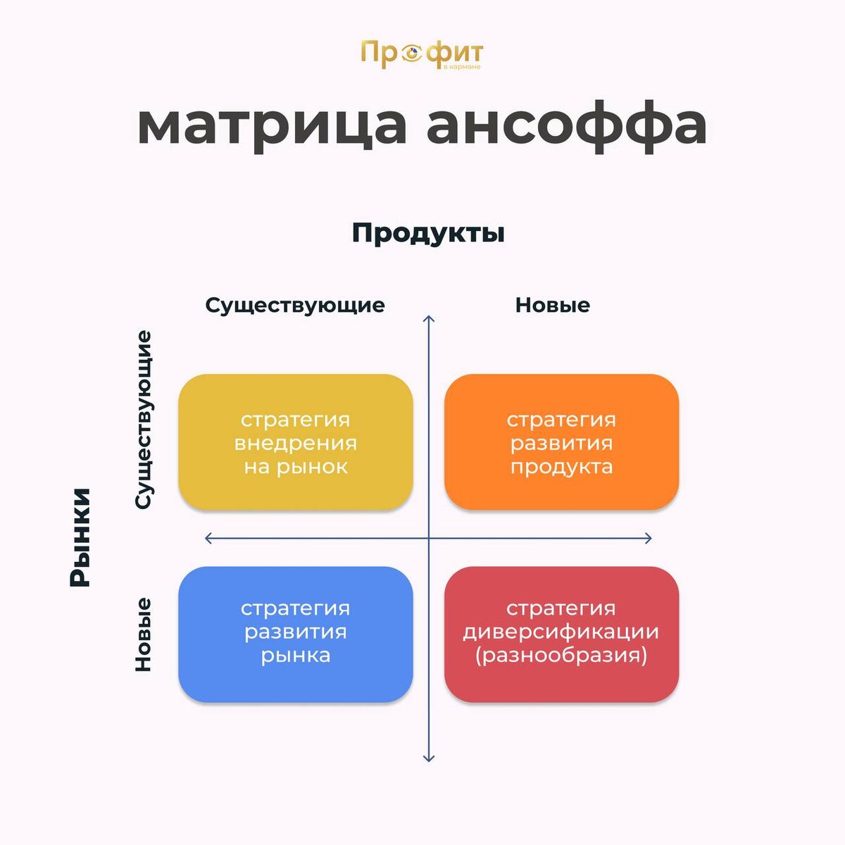😮💨 В товарном бизнесе рост часто путают с суетой. Кажется, если продажи встали, нужно срочно изобретать новый продукт. Но это самый дорогой и рискованный путь. Кейс: Компания производит авторские светильники из дерева. Продажи через соцсети шли бодро, но замерли на одной отметке. Владелец решил: «Рынок перенасыщен, давайте делать еще и садовую мебель». В чем ошибка? Предприниматель интуитивно выбрал путь с максимальным риском. Новая ниша, новая логистика, другие чеки. Мы предложили сначала «прогнать» бизнес через матрицу Ансоффа. В чем логика этой матрицы? Это система координат, где на одной оси — ваши Товары, а на другой — ваши Рынки (клиенты). У вас всегда есть 4 сценария, и двигаться по ним нужно от простого к сложному: — Сначала выжимаем свой рынок. Продаем больше светильников тем, кто о нас уже знает. — Затем идем к новым людям. Выходим на маркетплейсы или в интерьерные салоны с теми же светильниками. — И только потом создаем новое. Делаем торшеры для тех, кто уже купил лю