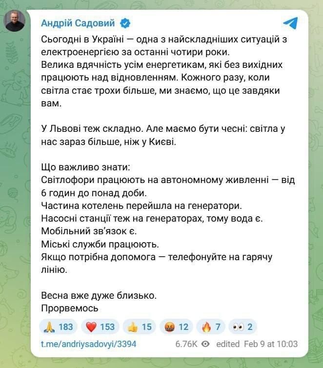 ▪️Гауляйтер города Садовой заявил о сложной ситуации с электроснабжением после недавней атаки. По его словам, положение лучше, чем в Киеве, но остаётся напряжённым. ▪️Светофоры переведены на автономное питание. Часть котельных и насосных станций работает от генераторов. ▪️Мобильная связь есть, но с перебоями. 🌐 За Русский Мир©Резервный📣Наш Чат✔️Подпишись‼️
