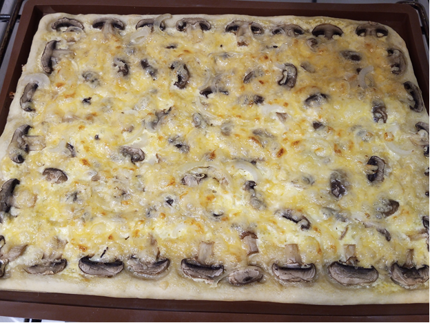 Пицца с моим любимым тестом. Ниже оставлю ссылки на другие составы теста, идеи для начинок. Состав моего любимого теста на пиццу: - мука – 150-200 гр.; - сахар – 1 чайная ложка; - соль – ½ чайной ложки; - дрожжи – 10 гр.; - теплая вода – 100 мл.; - растительное масло – 1 ст. ложка. Состав начинки: - грибы шампиньоны – 250 гр.; - сыр твердых сортов – примерно 70 +/- гр.; - майонез – 1-1,5 ст. ложки. В углубление муки добавленной в глубокую емкость или муку, насыпанную на столешницу добавить дрожжи, сахар, соль, воду, растительное масло замесить тесто. Тесто накрыть полотенцем или пленкой оставив в теплом месте для увеличения в 2 раза (20-30 минут). Шампиньоны промыть, обсушить бумажным полотенцем, нарезать на тонкие слайсы. Сыр натереть на терке. Готовое тесто переложить на смазанный растительным маслом пергамент или силиконовый коврик руками придав круглую около 30 сантиметров форму или прямоугольную (у меня на фото силиконовый коврик 28 см. на 36 см.). Отступив от краев около одного с