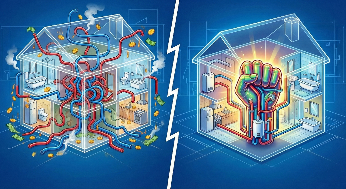 Знаете, как выглядит страшный сон инженера-сантехника? Это когда вы приносите ему проект дома, где котельная в подвале слева, кухня — на первом этаже справа, а хозяйский санузел — на втором этаже по диагонали в противоположном углу. В архитектурной среде это называется «размазать мокрые зоны». Заказчик обычно думает: «Ну какая разница, трубы же гибкие, дотянем». Разница есть. И она измеряется сотнями тысяч рублей на этапе стройки и годами раздражения в быту. Сегодня говорим о принципе «Мокрого кулака». В правильном доме инженерные системы должны быть компактными, как двигатель в спорткаре. Идеальная схема компоновки выглядит так: Все потребители воды собраны вокруг источника тепла в радиусе 3-5 метров. Это и есть «Мокрый кулак». Если ваш архитектор разбросал санузлы по углам дома, как изюм в булке — он спроектировал вам «финансовую дыру». Почему это плохо? Давайте считать. Это то, что нельзя исправить после постройки. Никогда. Представьте: вы просыпаетесь утром, идете в душ, открываете
