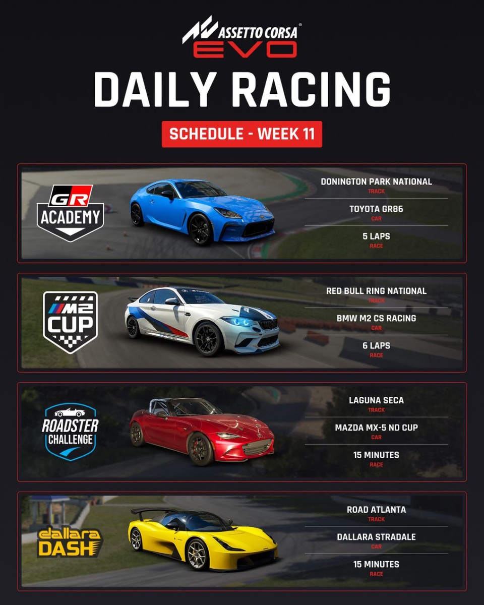 GR Academy - Donington Park National - Toyota GR86 - 5 Laps BMW M2 Cup - Red Bull Ring National - BMW M2 CS Racing - 6 Laps Roadster Challenge - Laguna Seca - Mazda MX-5 ND Cup - 15 Minutes Dallara Dash - Road Atlanta - Dallara Stradale - 15 Minutes GT3 Sprint Cup - Suzuka GP - BMW M4 GT3 Evo - 25 Minutes Flat Six Series - Fuji Speedway GP - Porsche 911 GT3 Cup - 25 Minutes MC GT Trophy - Nurburgring GP Strecke - Maserati GT2 - 40 Minutes t.me/AC_Cafe