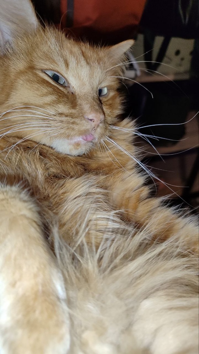 В определенный момент это могло быть мемное фото со смешной харей кота, сейчас же он так выглядит постоянно. Обезвоживание, подходит к миске с водой и падает, пить не может, мышцы рта и язык не контролируются. В больнице, где он находится теперь, ему поставят капельницу, витамины и катетор с едой. Пищу будут вливать прямо в глотку насильно, принудительно. Завтра пойдем навещать. Очень волнуюсь.