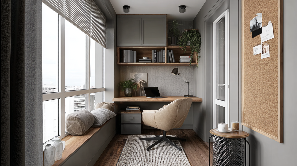 Когда техническая часть готова, можно думать об обустройстве. На стандартном балконе в 3–4 квадратных метра лучше всего работает Г-образная планировка или длинный узкий стол вдоль стены. Так вы максимально используете естественный свет и не будете чувствовать себя в клетке.