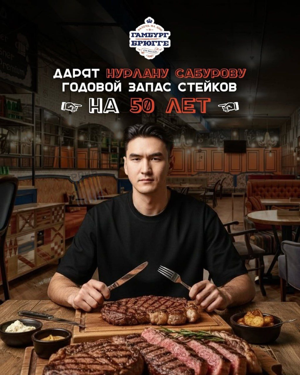 Красноярский паб подарил Нурлану Сабурову годовой запас стейков на 50 лет.