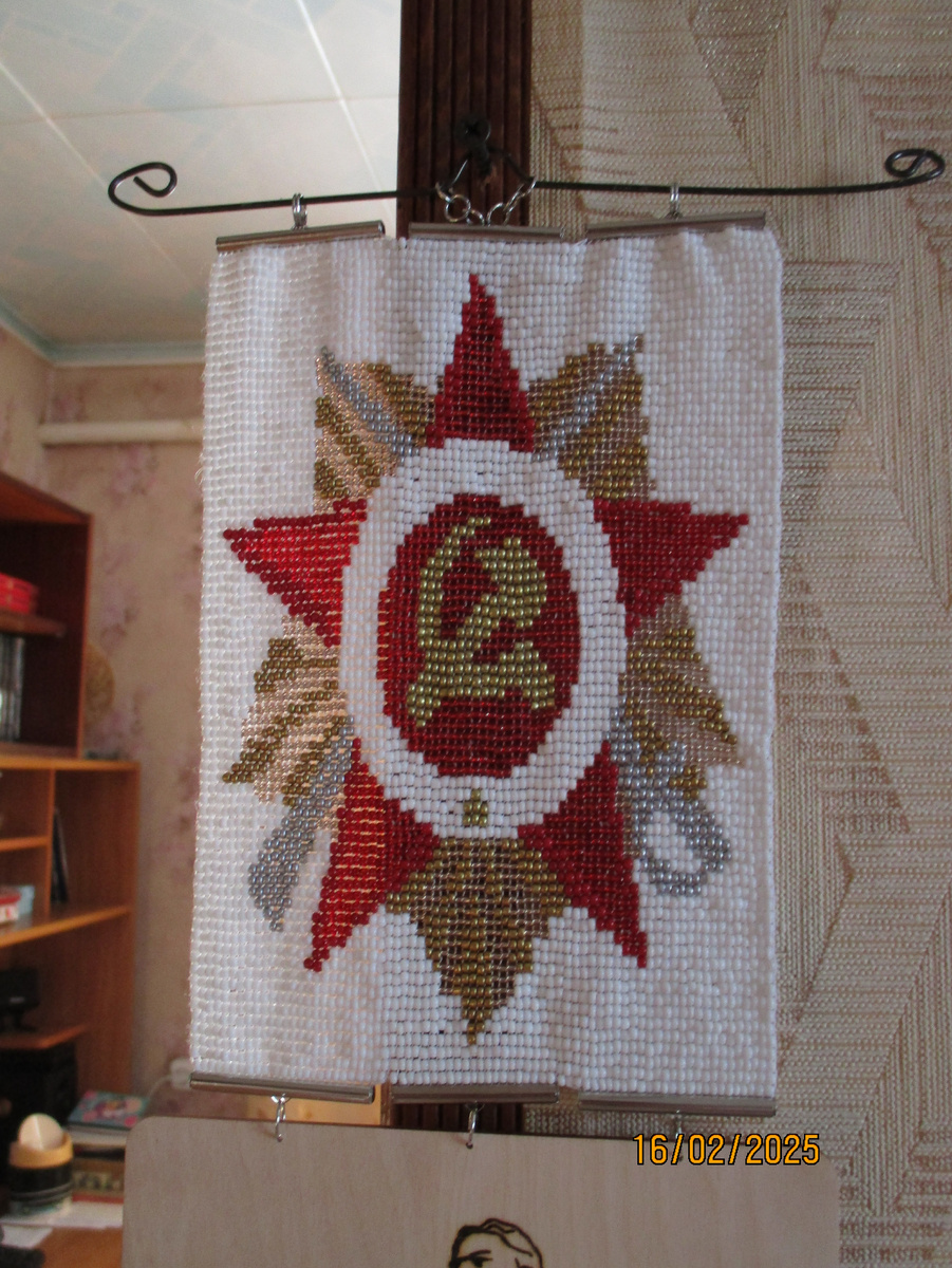 Я, крайне редко, делаю конкурсные работы или экспозиционные, потому как они требуют огромного количества усилий на всех этапах. Пример такой работы — это моя конкурсная работа на Областной конкурс декоративно-прикладного творчества «Я ПОМНЮ! Я ГОРЖУСЬ!», посвященный 80-летию Победы в Великой Отечественной войне 1941 – 1945 г.г. Называется она не затейливо "Помню, Горжусь", несмотря на глубокий смысл и продуманность концепции. К сожалению, с названиями у меня всегда были проблемы, или через чур просто или через чур заумно. Первый этап - эта разработка концепции. Как мы помним две тысячи двадцать пятый год был годом восьмидесятилетия Победы в Великой Отечественной Войне. Праздник крупный, патриотический и очень важный для каждого гражданина нашей страны. Поэтому в концепции должна была сосредоточится историко-патриотическая направленность, при этом работа должна была сохранить дух гордости за страну. Для начала были отобраны эскизы для работы. Первый эскиз, выбранный для ткачества: Орде