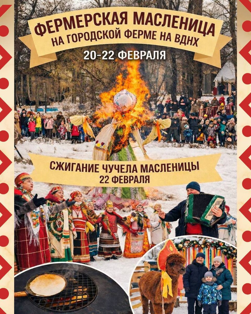 Провожаем зиму по-настоящему – с масленичными гуляниями, блинами и весельем для всей семьи! В программе: 🔘Общение с животными; 🔘Уличные игры, эстафеты и хоровод; 🔘Мастер-классы и экскурсии для детей и взрослых; 🔘Фермерские угощения и блины; 🔘Лотерея и тематические фотозоны. 🎁 Квест, соберите печати и получите блин с чаем в подарок. 🔥 Сжигание чучела Масленицы – 22 февраля в 17:00. Не пропустите главный финал этой зимы. ⏰ 20-22 февраля 🎫 БИЛЕТЫ и подробная информация ЗДЕСЬ *️⃣-10% на билеты по промокоду ДЕТЯМ10 #Масленица_лд_26 😍 Канал Лучшее детям: в Max/ канал VK/ Телеграм