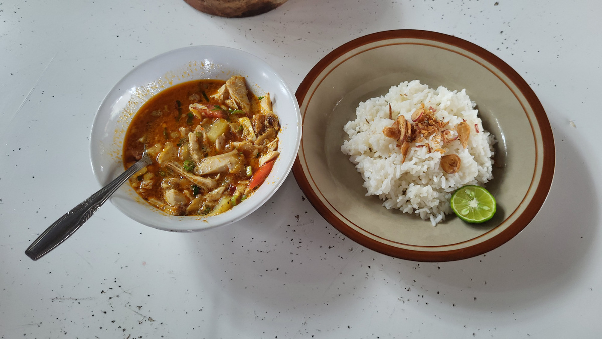 Можно всё смешать, можно есть рис и запивать бульоном, можно по-немногу поливать бульоном рис и тд., как говорится - ешьте как хотите. Я весь рис добавила в бульон. Сото понравилось. По-сути это суп, и его очень много разновидностей. Это блюдо чем-то напоминает мокеку, только там вместо мяса морепродукты. А бульон напоминает вкус тайского том кха и том яма. Такая порция стоит 22 000 рупий или 100 рублей.