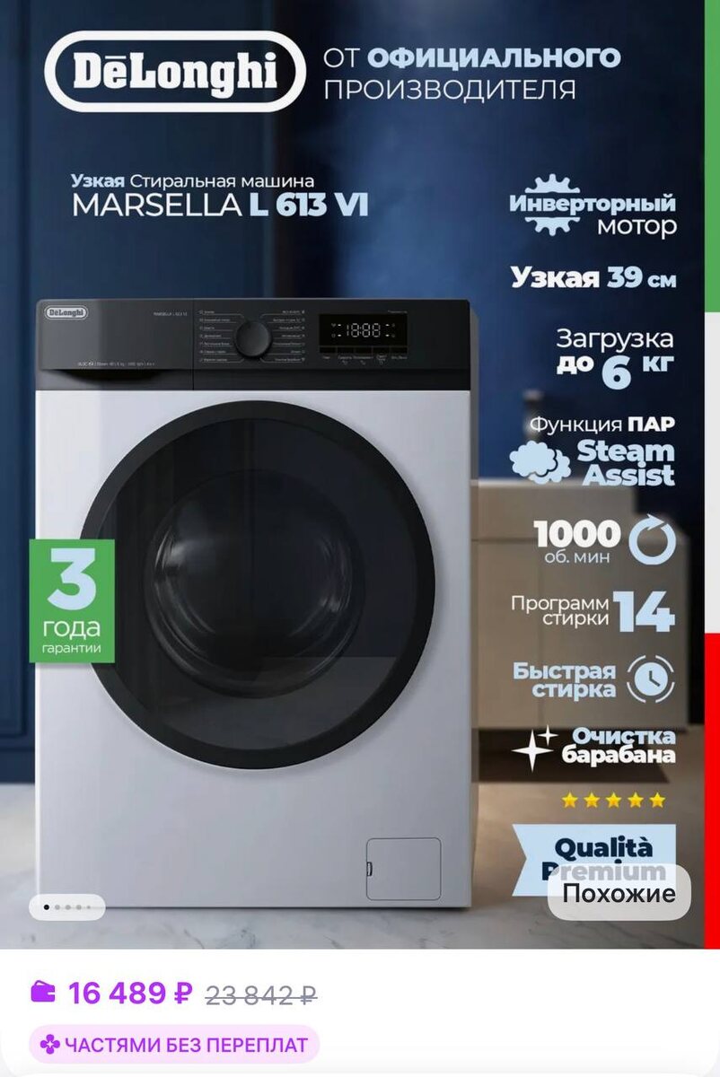 😀😀😀😀😀DeLonghi Стиральная машина автомат MARSELLA L 613 VI инвертор, пар