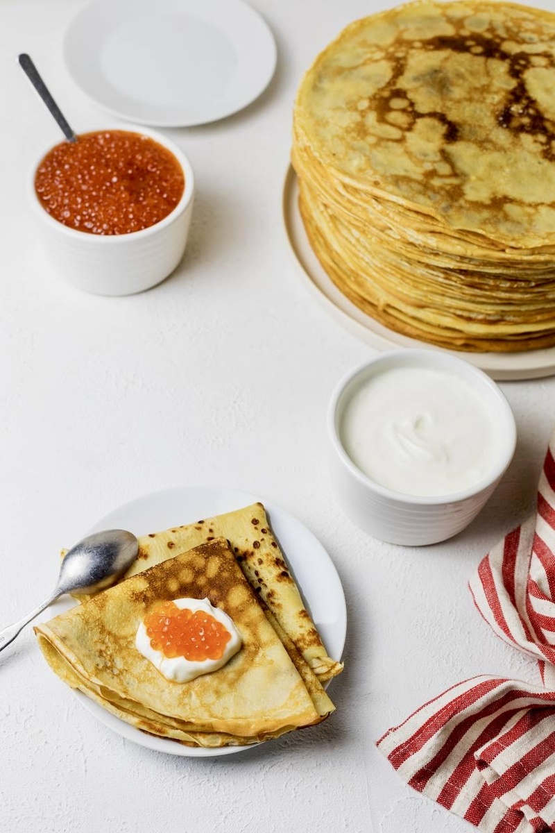 Ингредиенты: ▫️ пшеничная мука — 8 ст. л. ▫️ икра красная — 1 банка ▫️ сметана — 100 г ▫️ яйца куриные — 2 шт. ▫️ нежирный кефир — 500 мл ▫️ оливковое масло — 3 ст. л. ▫️ сахар коричневый — 1 ст. л. ▫️ сода — ½ ч. л. ▫️ соль морская — 1 щепотка Способ приготовления: 1. Налить в глубокую посуду кефир, всыпать соду и соль, все перемешать. 2. В отдельной посуде слегка взбить яйца с сахаром, влить в кефир с содой и еще раз перемешать. 3. Непрерывно помешивая, постепенно всыпать муку — по одной ложке, чтобы тесто получилось без комков. В конце влить 2 ст. ложки оливкового масла, перемешать. 4. Разогреть сковороду для блинов, смазать ее оливковым маслом и выпекать тонкие блины. 5. Каждый блин сложить пополам, затем еще раз сложить, чтобы получился треугольник, положить на него немного сметаны, а сверху — красную икру. Приятного аппетита!