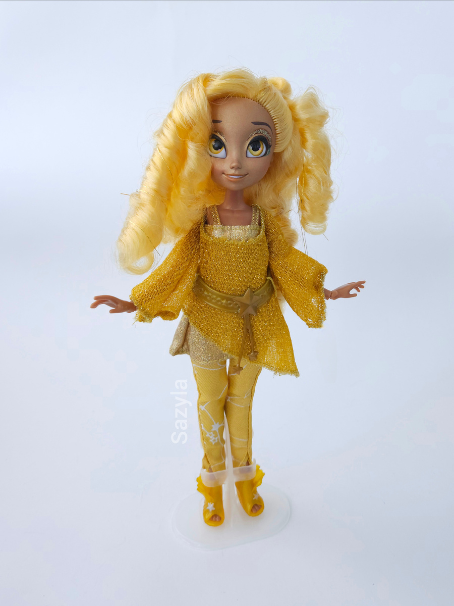 В серии должно было быть 12 кукол (по количеству персонажей), но вышло всего пять. И из них Леона покорила меня своими фантастическими кудряшками, хотя желтый и не самый мой любимый цвет. Так же в прическе есть люрикс. Он, безусловно, подходит серии, но кудри из него не особо получаются, поэтому выглялит это не очень, особенно сзади.