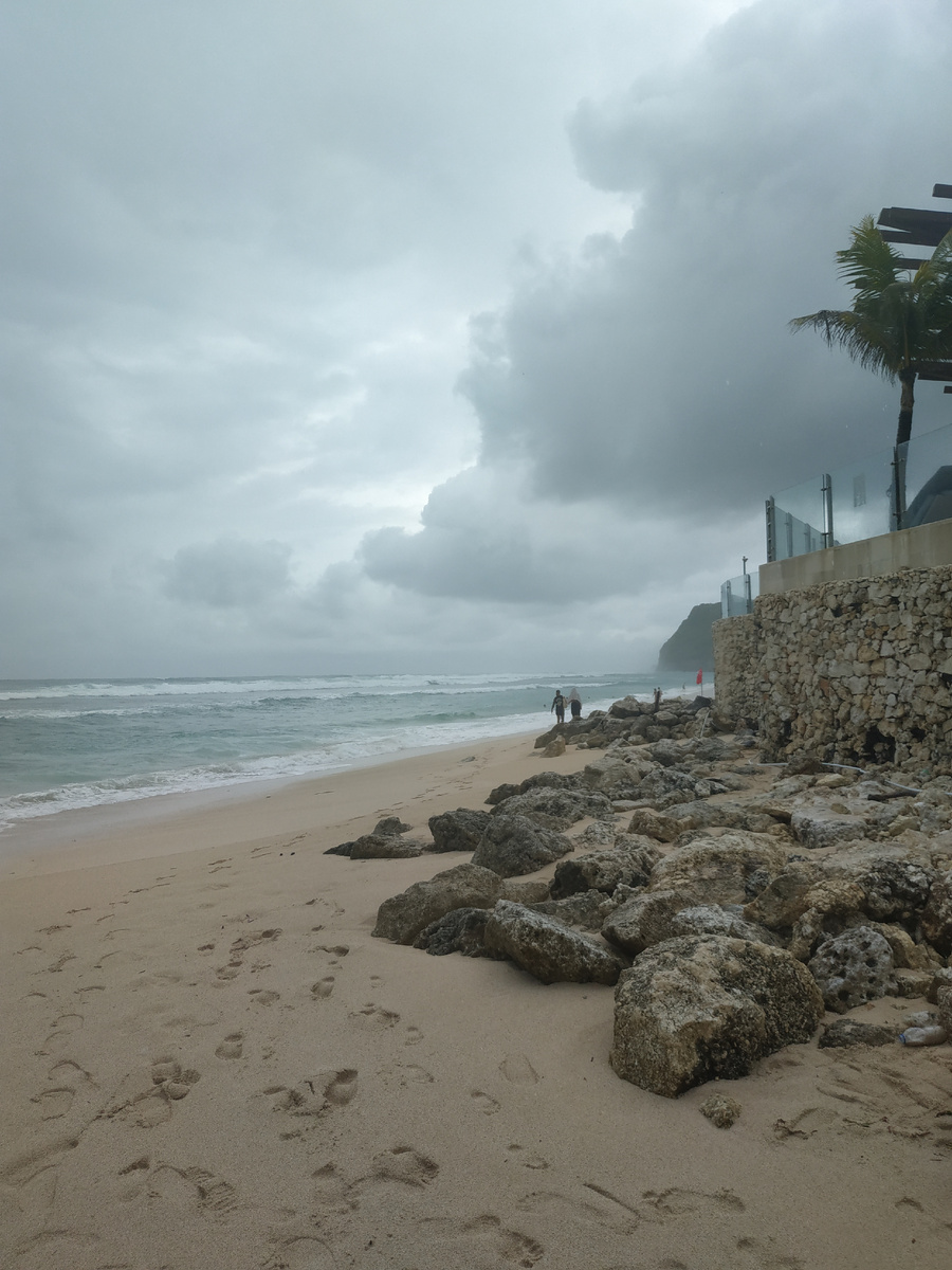 Утром 22.01.26 встретились с нашими друзьями, поехали на пляж Паданг - Паданг рядом с отелем Padang. Шел дождь и штормило. Искупались первый раз полноценно и посмотрели на серферов.
