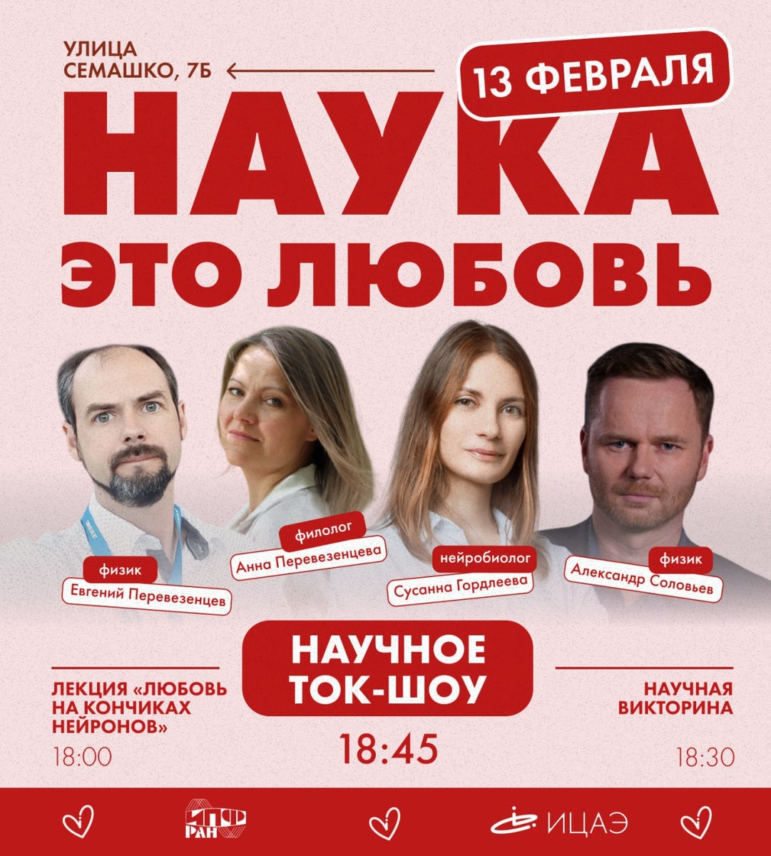 Лекция «Любовь на кончиках нейронов» — 18:00 Возможно ли объяснить любовь с точки зрения нейронауки? Разберемся вместе с Викторией Турубановой, ведущим научным сотрудником Научного центра генетики и наук о жизни Университета Сириус. Научная викторина — 18:30 Ток-шоу «Наука – это любовь» — 18:45 «Научные пары» из разных областей порассуждают о том, как и когда возникает любовь, а также совместимы ли научная карьера и личная жизнь. Зрители из зала тоже смогут задать вопросы! 13 февраля в 18.00 Семашко 7Б Вход свободный по регистрации 😄 Мероприятия Нижний Новгород. Я местный! 📱 Telegram | 📲 MAX