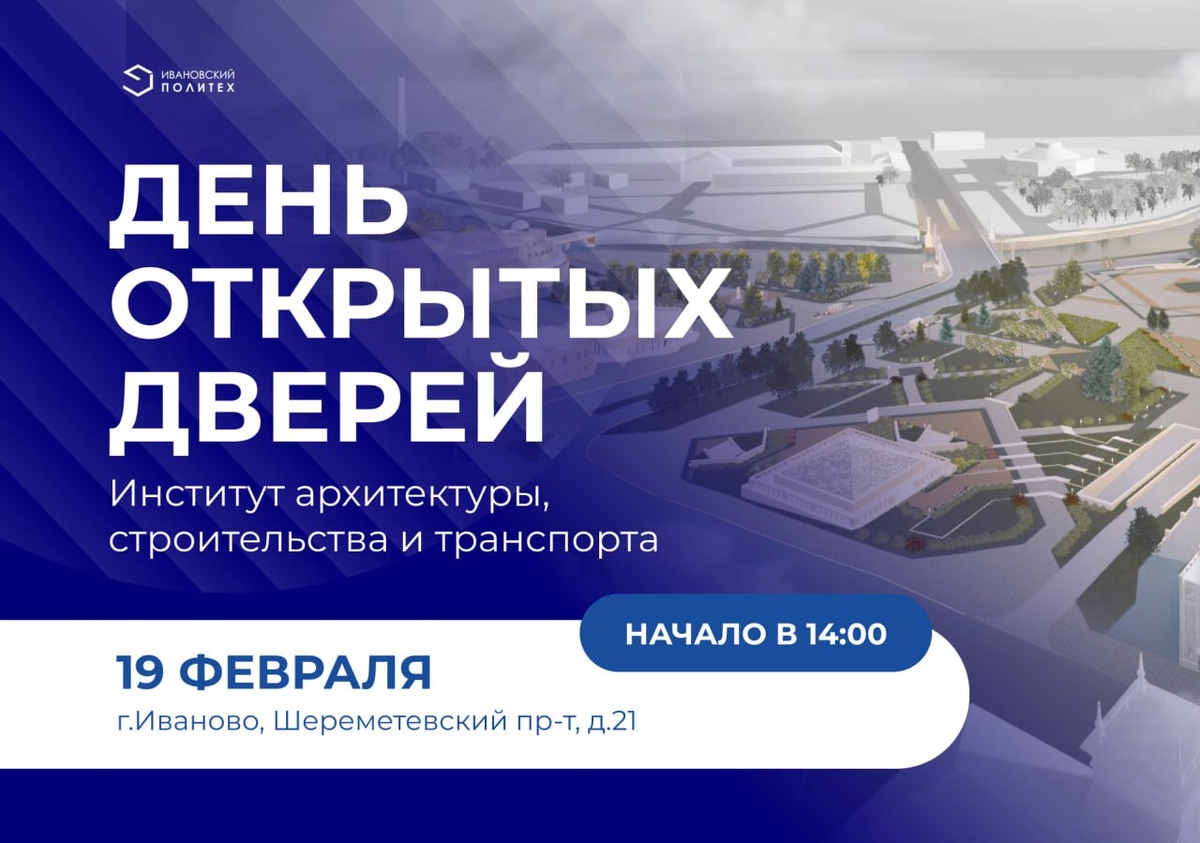 🏛 Института архитектуры, строительства и транспорта Ивановский Политех приглашает учащихся школ, лицеев, гимназий, студентов колледжей и техникумов, а так же родителей будущих абитуриентов. 📅 19 февраля ⌚️ 14:00 📍 г. Иваново, Шереметевский проспект, д. 21 В программе дня: ✅ Презентация востребованных направлений: от архитектуры и строительства до экотехнологий и нанокомпозитов. ✅ Интерактивные зоны и мастер-классы, где можно погрузиться в профессию. Это Ваш шанс подробнее узнать об условиях поступления, познакомиться с особенностями студенческой жизни, узнать о программах с двойными квалификациями, встретиться с преподавателями и студентами, а также поучаствовать в интерактивных зонах. За активное участие Вас ждут подарки! 🎁 Не упустите такую возможность! ‼️ Регистрация на мероприятие обязательна‼️ 🔍 Узнайте больше о наших программах подготовки 👉 на сайте 📞 Приемная комиссия: ВУЗ тел.: +7 (800) 100-02-36, +7 (4932) 41-28-55, +7 (4932) 30-45-01 Колледж тел.: 32-97-55 💬