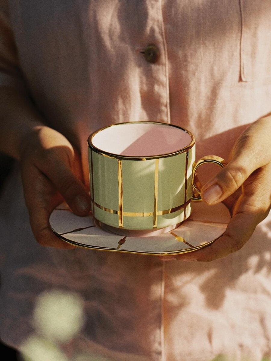 ? Чайные пары daje x Kesler ceramics ручной работы из полуфарфора и настоящего 12% золота: блюдца неровные, толщина гуляет, линии декора не совпадают идеально. И как же это прекрасно!