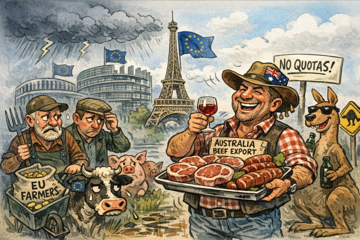 в ЕС до 99 тыс. тонн говядины, около 180 тыс. тонн мяса птицы, а также расширение доступа по сахару и этанолу. Документ еще не дошел до ратификации и, судя по настроениям в аграрных регионах Европы, может ещё очень долго согласовываться... Тем не менее Брюссель уже возобновляет переговоры по аграрной части соглашения с Австралией. Канберра настаивает на радикальном увеличении квот и фактически на свободном доступе своей продукции на рынок ЕС. ⤴️ Австралия входит в тройку крупнейших экспортёров говядины с объёмом свыше 1,5 млн тонн в год. Поэтому прописанные в соглашении десятки тысяч тонн австралийцы прямо называют экономически бессмысленным шагом. Для Европейского союза - это очередной удар по аграрному сектору, который и без того находится под давлением. Даже расширение квот на 1–2% от потребления ЕС способно обрушить цены в чувствительных сегментах рынка, прежде всего во Франции, Ирландии и Бельгии, где животноводство балансирует на грани между ростом издержек и требованиями «зелё