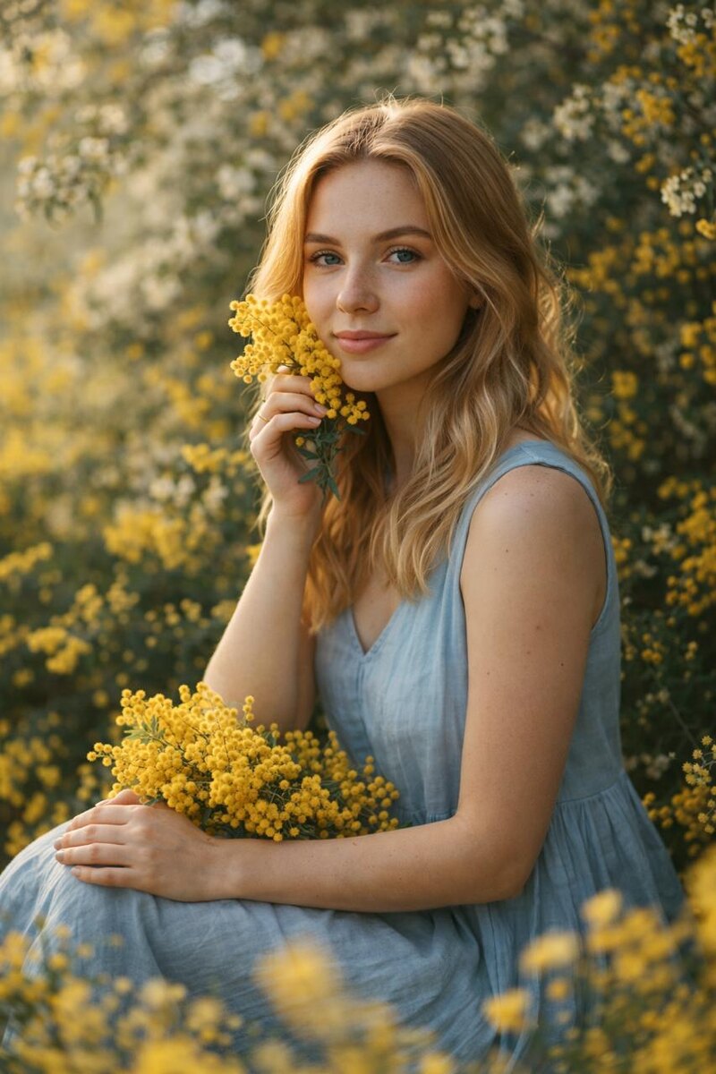 Модель: Nano Banana Сгенерировать🪄 Высококачественный портрет в формате 9:16. КРИТИЧЕСКИ ВАЖНО: Точно воспроизвести черты лица с загруженных фотографий — 100% сходство с исходными изображениями. Композиция и поза: Персонаж сидит среди ярких жёлтых цветов (мимоза) Корпус развёрнут вправо Взгляд направлен прямо в камеру Выражение лица: мечтательное, спокойное Левая рука держит пучок жёлтых цветов у подбородка Правая рука поддерживает букет на коленях Одежда: Свободное голубое платье Мягкая ткань с текстурой лёгкого хлопка Естественные складки материала Освещение: Мягкий естественный свет слева Подчёркивает свежесть кожи и черты лица Тёплая, уютная атмосфера Окружение: Фон: частично размытые ветви с жёлтыми и белыми цветущими соцветиями Передний план: размытые жёлтые цветы для глубины Общее настроение: весенняя идиллия, природная гармония Технические требования: Фотореалистичное изображение Высокая текстурная детализация Качество: 8K Формат: 9:16