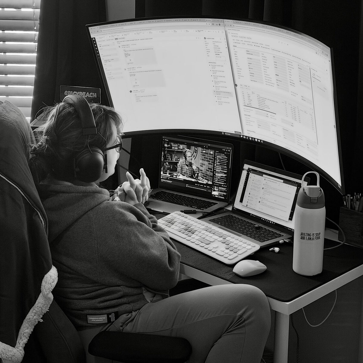Уж почем мы не любим внешние мониторы, но вот такое рабочее место — это... прикольно! Интересно только, как там шея себя чувствует к концу дня?