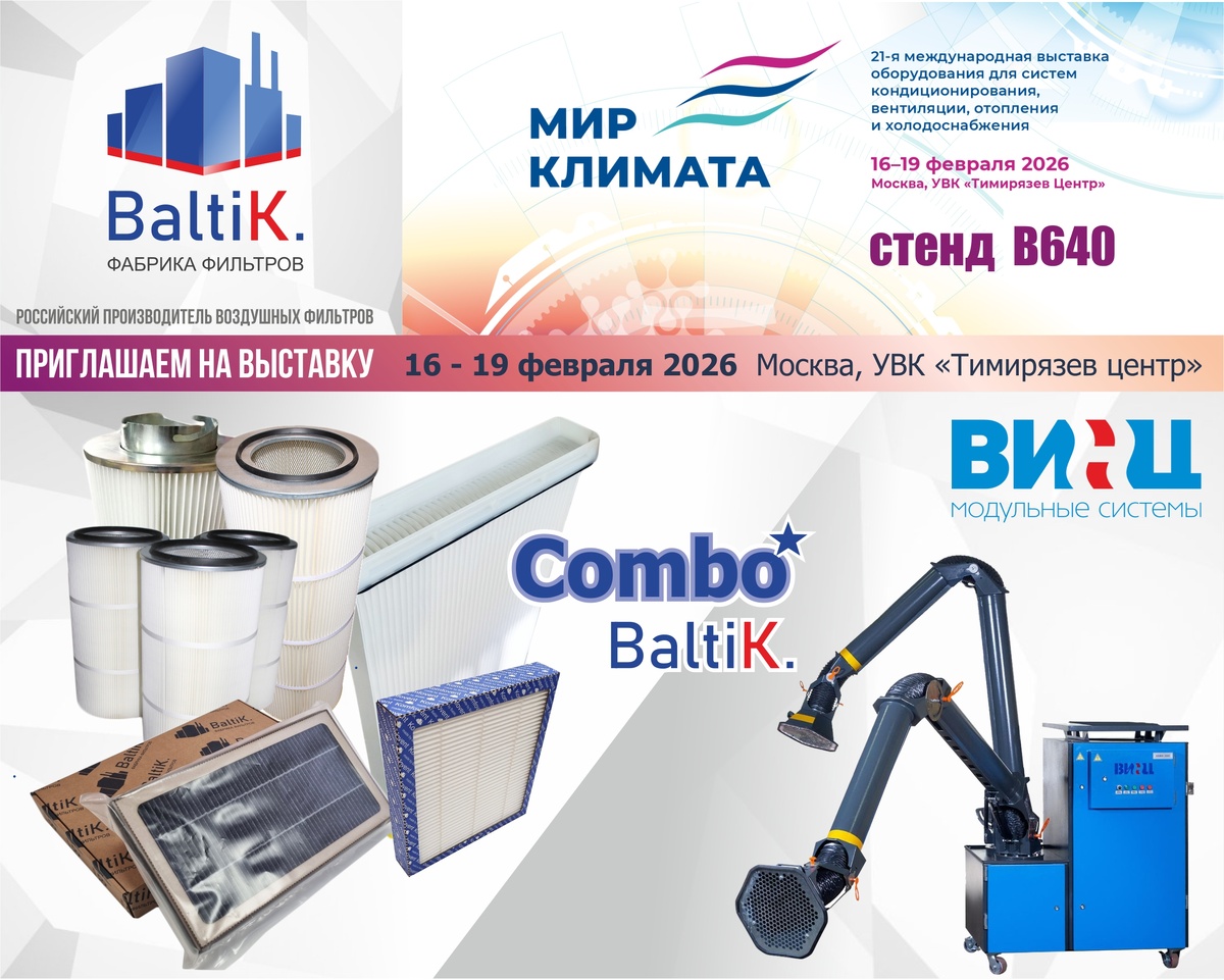 Уважаемые коллеги и партнеры! Приглашаем вас на выставку “Мир климата 2026” 16–19 февраля в УВК «Тимирязев Центр» (Москва), стенд #B640. На нашем стенде #B640 будет представлено суперкомбо⭐ из двух самых популярных направлений — фильтрующие элементы нового поколения для вентиляции и фильтрующие картриджи для промышленной аспирации. На выставке вы сможете по достоинству оценить качество нашей продукции, убедиться в надёжности и лаконичности фильтрующих элементов. Вы получите ответ на самые главные вопросы: «В чём преимущество наших фильтров перед импортными поставщиками?», «Какие технологии мы применяем?», «Почему нас выбирают ведущие производители фильтровентиляционного оборудования?» Ценовая конкуренция на рынке стремительно растёт, импортные поставщики предлагают товар по низкой стоимости — все эти факторы помогли нам совершить огромный рывок вперёд. Проектно конструкторский отдел Фабрики фильтров «BaltiK.» нашёл золотую середину между качественным продуктом и презентабельным внешним