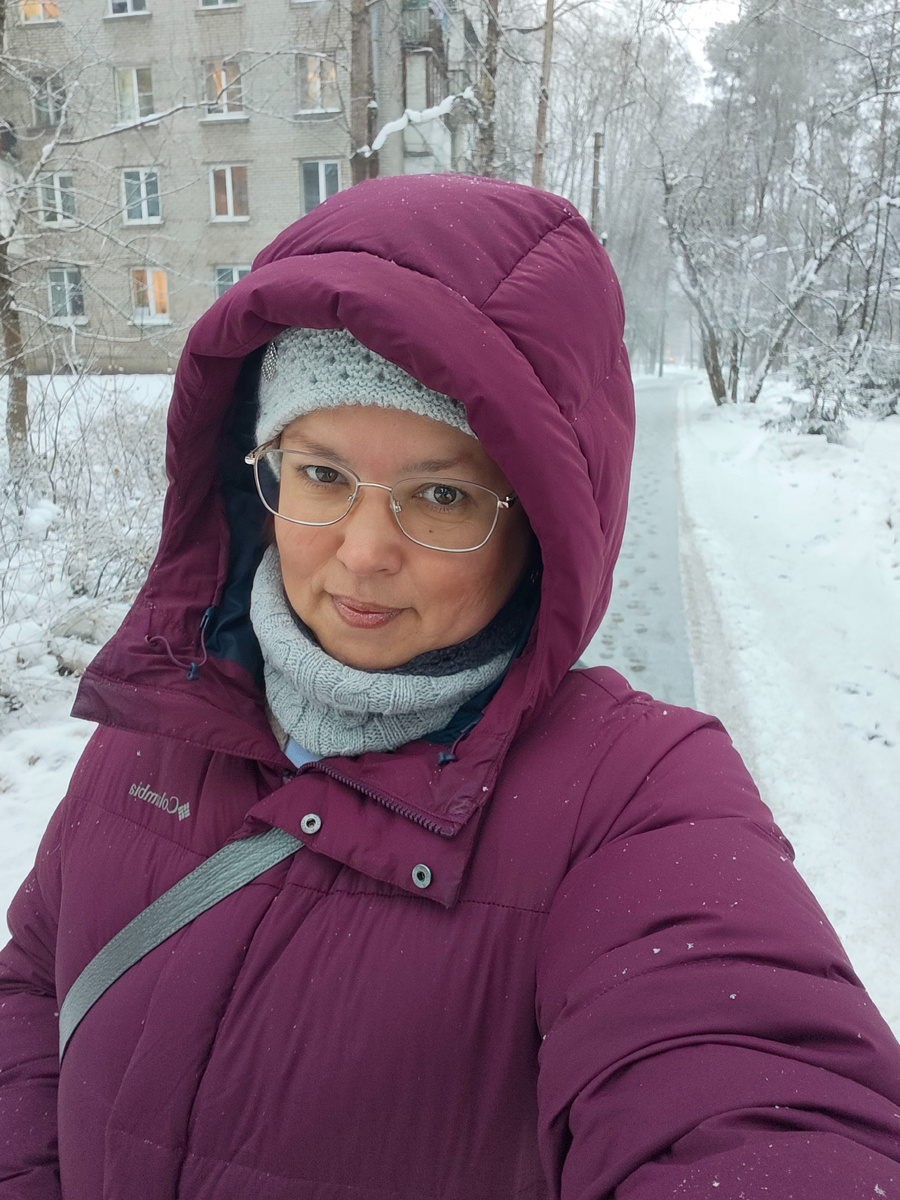 Пока шла утром вокруг тишина, ни души, только трактор чистил дорожки и машины сигналили в пробке. Было начало десятого, снег попадал на очки, началась лёгкая метель.