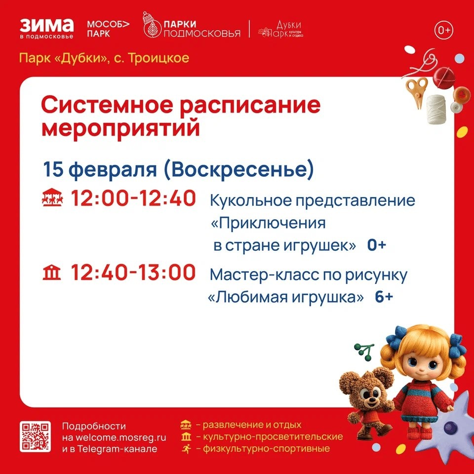 ✨ В воскресенье в парке Дубки будет интересно 🗓 ВОСКРЕСЕНЬЕ (15 февраля) 🧸 12:00-12:40 Кукольное представление "Приключения в стране игрушек" (0+) 🎨 12:40-13:00 Мастер-класс по рисунку "Любимая игрушка" (6+) 📆 15.02.2026 🏢 Парк культуры и отдыха «Дубки» 📍 г.о.Чехов, с.Троицкое, парк "Дубки" 🪙 Вход свободный❗️ ⭐Поддержать канал голосом ✅ Мероприятия Чехов https://dzen.ru/id/66cc4b48e9ef144699238a51 http://vk.com/chekhov_events http://dzen.ru/chekhov_events
