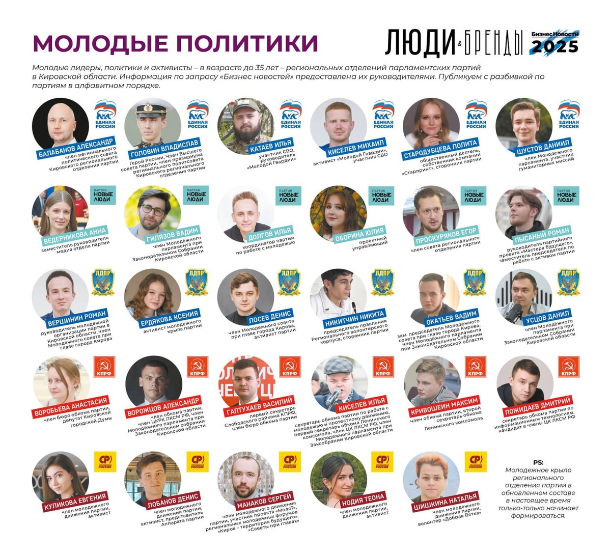 ». Это еще одна новая номинация рейтинга. Вне рамок голосования. Мы решили показать политически активную молодежь Кировской области и целенаправленно поддержать новое поколение лидеров. Именно молодежное крыло партий формирует кадровый резерв, привносит свежие идеи и энергию, определяя в том числе политическую повестку на перспективу. Кандидатов по просьбе «Бизнес новостей» представили региональные отделения парламентских партий. По мнению редакции, это органично вписывается в концепцию рейтинга: создавать публичную площадку для знакомства с теми, от кого зависит будущее региона. Смотрим, что из этого получилось.