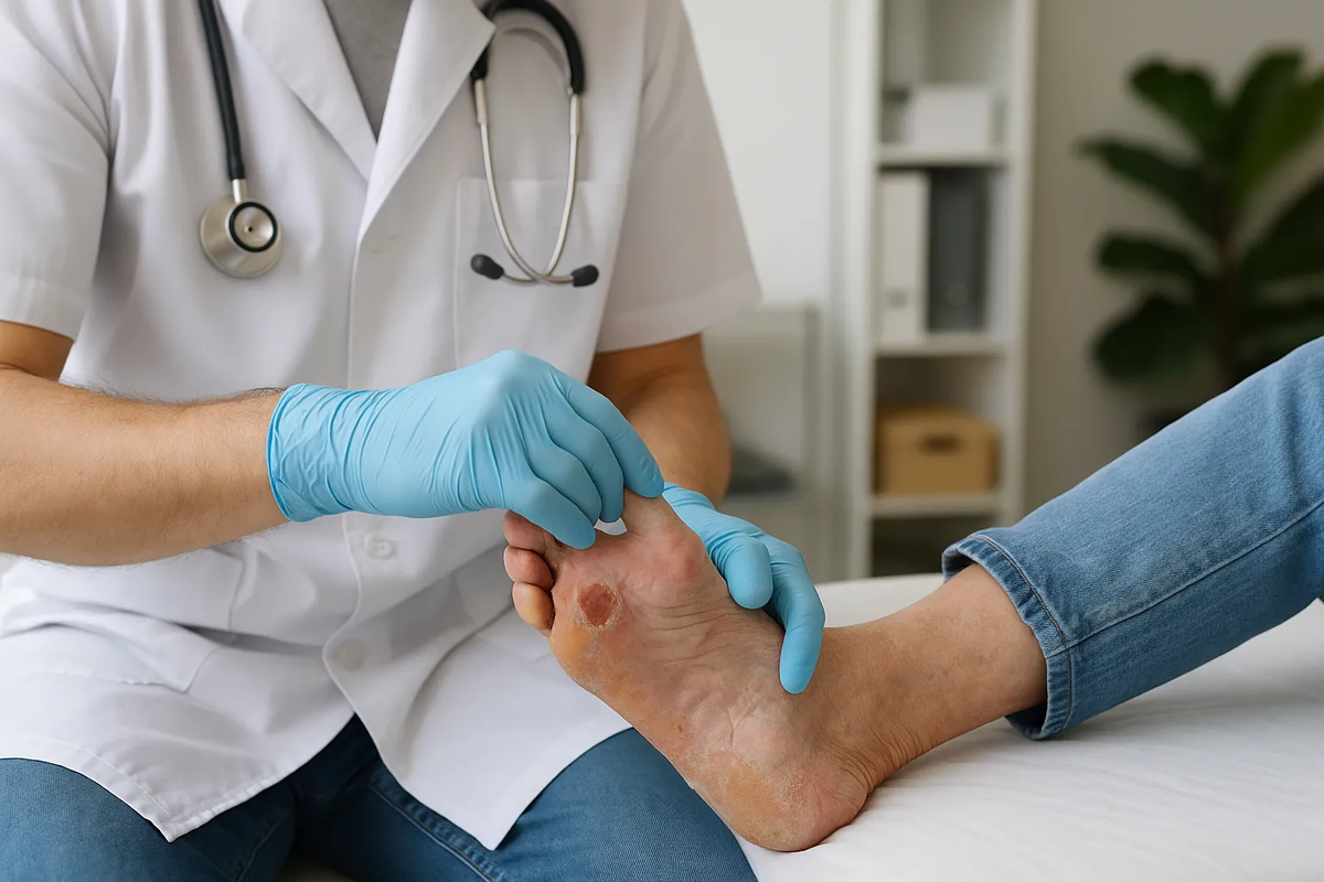 - Нейропатия: Высокий сахар годами разрушает нервные волокна. Стопы теряют чувствительность — вы не чувствуете боли от трения, давления, пореза или ожога. Это состояние называется «синдромом нечувствительных ног».