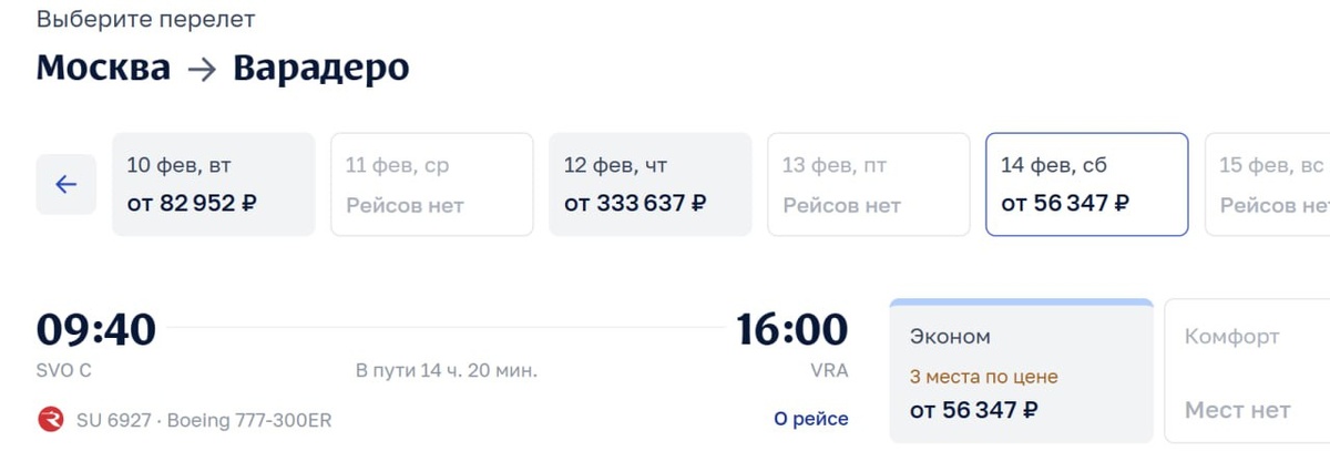 В системе «Аэрофлота» снова появились рейсы авиакомпании «Россия» на Кубу на ближайшую неделю. Например, можно купить билеты из Москвы в Варадеро на 10, 12 и 14 февраля, в Гавану доступны для бронирования места на 15 февраля. Однако после этих дат рейсов на Кубу нет в расписании. @tourdom