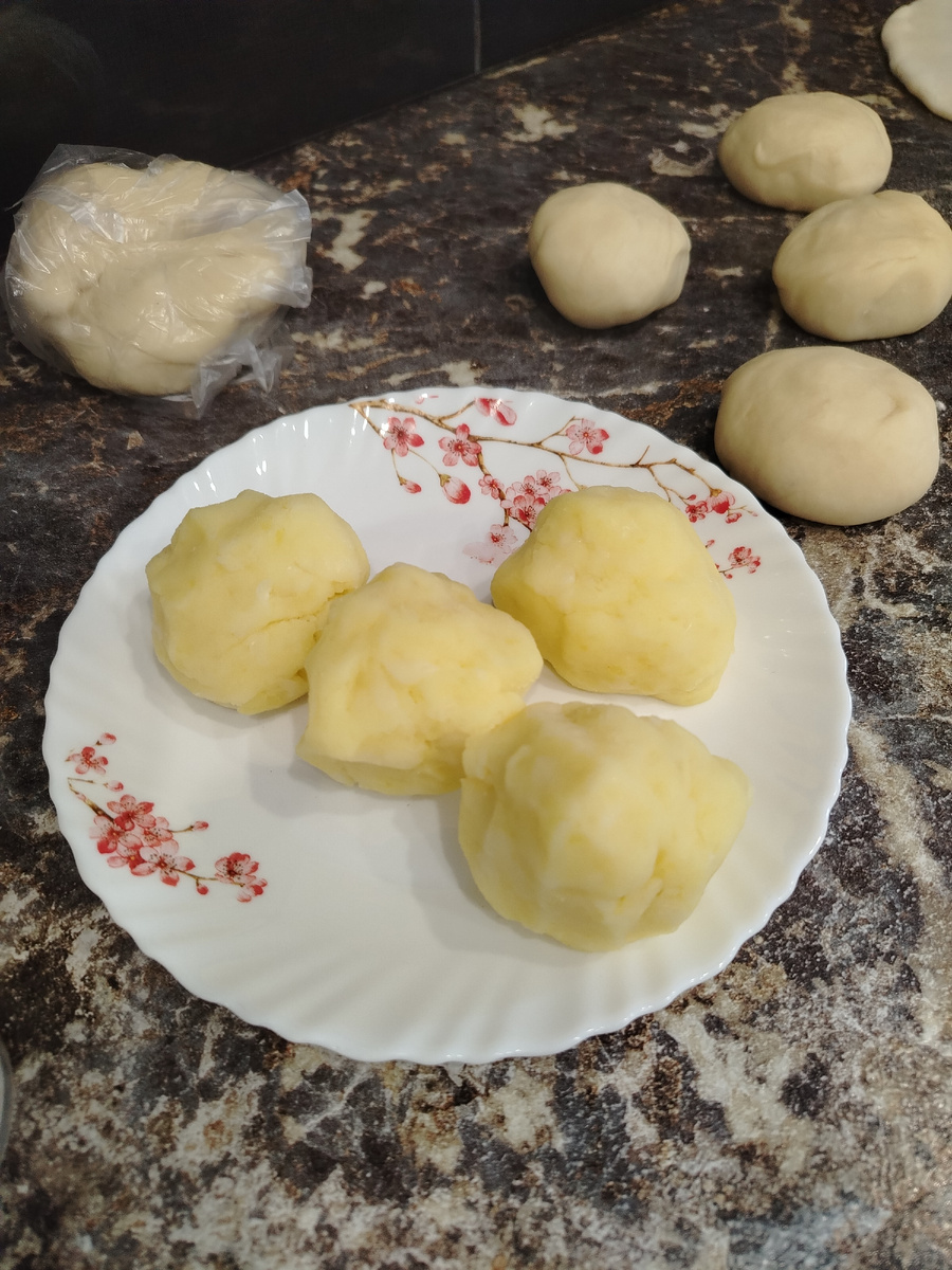 Каждый шарик теста слегка раскатайте, в центр положите картофельный шарик, затем соберите края теста в центре, защипнув их.
