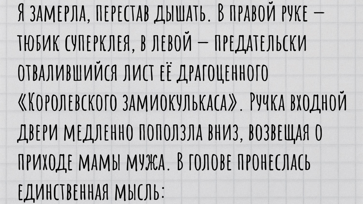 Я замерла, перестав дышать. В правой руке — тюбик суперклея, в левой — предательски отвалившийся лист её драгоценного «Королевского замиокулькаса». Ручка входной двери медленно поползла вниз, возвещая о приходе мамы мужа.