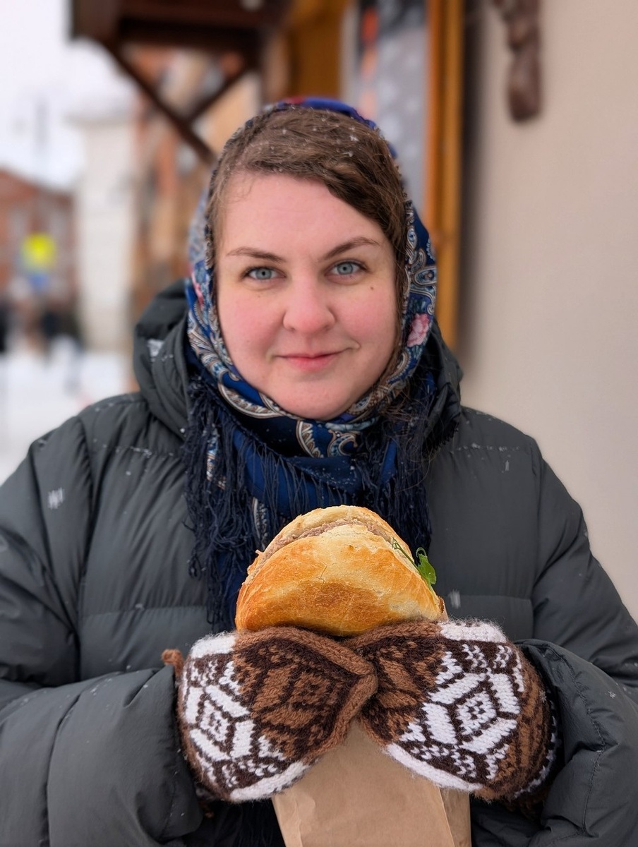 На руках надеты варежки с узором, в руках держит коломенский калач. Глаза голубые, на лице румянец от мороза. Окружение — старинный русский город с деревянными одноэтажными домами. Фон размыт. Фотореалистичный стиль, естественные цвета, 8K разрешение изображения.