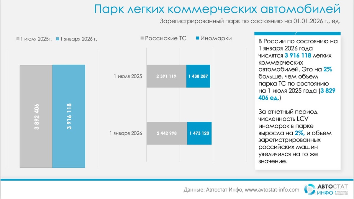 в Москве: парк растет, но стареет По данным «Автостат Инфо», на 1 января 2026 года в России насчитывается 3 916 118 легких коммерческих автомобилей, из них Москва концентрирует 384 208 машин, то есть почти десятую часть национального парка (9,81 %). За полгода зарегистрированный парк LCV в стране вырос на 2 % (с 3 829 406 ед.), а в столице примерно 1 % относительно 1 июля 2025 года (379 885 ед.). По мнению аналитиков, это говорит о умеренном, но устойчивом расширении сегмента. Федеральный парк рос равномерно как за счет отечественной техники, так и за счет иномарок. К 1 января 2026 года в России числятся на учете 2 442 998 российских LCV и 1 473 120 иностранных. Полгода назад их было 2 391 119 ед. и 1 438 287 ед. соответственно. Оба сегмента прибавили примерно по 2%, поэтому баланс сил между ними не меняется: рынок заполняется и новыми моделями, и уже присутствующими брендами, без явного смещения в одну сторону. Москва выглядит более «смешанным» рынком. В столичном парке 55% прих