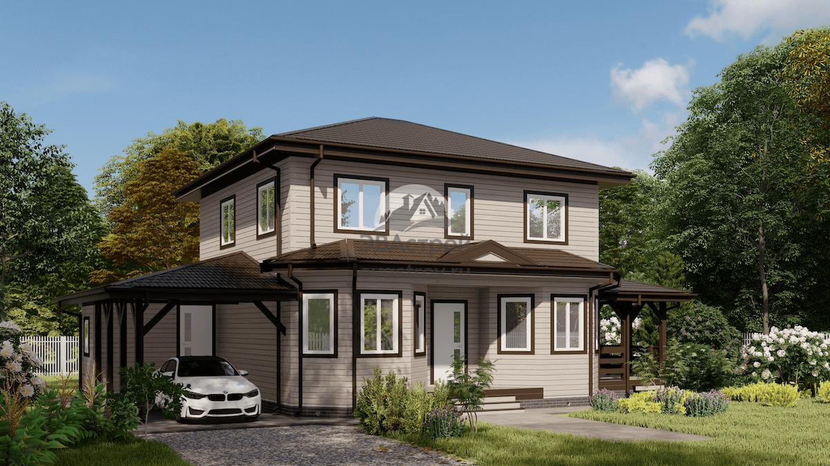 Номер проекта: 107-03 (П45) Разделы проекта: Архитектурный и Конструктивный разделы Узнать о проекте больше можно на сайте evastroy.ru или по телефону +7 (495) 175-30-40 Двухэтажный дом общей площадью 182 м2 отлично подойдет для семьи из пяти человек. Среди главных достоинств проекта в европейском стиле — полноразмерный верхний ярус, облегчающий оформление интерьера, терраса и практичный навес для автомобиля. Первый этаж ориентирован жилыми комнатами в сторону главного двора, а хозяйственные помещения занимают пространство у задней стены. бойлерная, санузел и кухня расположены на одной линии, что удобно для прокладки инженерных сетей. Дневная зона (гостиная + кухня-столовая) отличается обилием окон, одно из которых ведет на крытую террасу. Рядом с эркерной нишей нашлось место для ТВ-уголка с удобным диваном и журнальным столиком. В интерьере кухни достаточно места для всей кухонной техники и столешниц, а также для обеденного стола, где поместится вся семья. Отдельная спальня и санузел