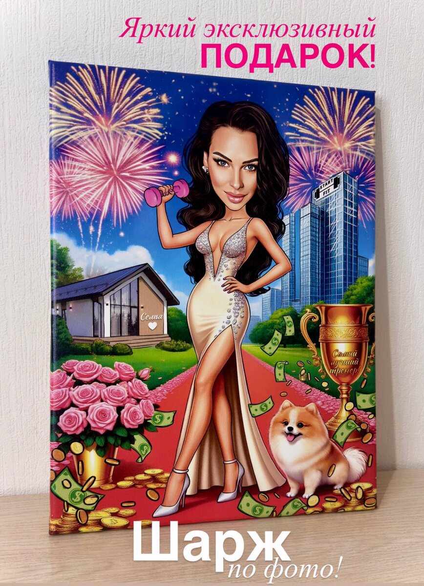 на фото: цифровой шарж + печать на холсте, натяжка на подрамник