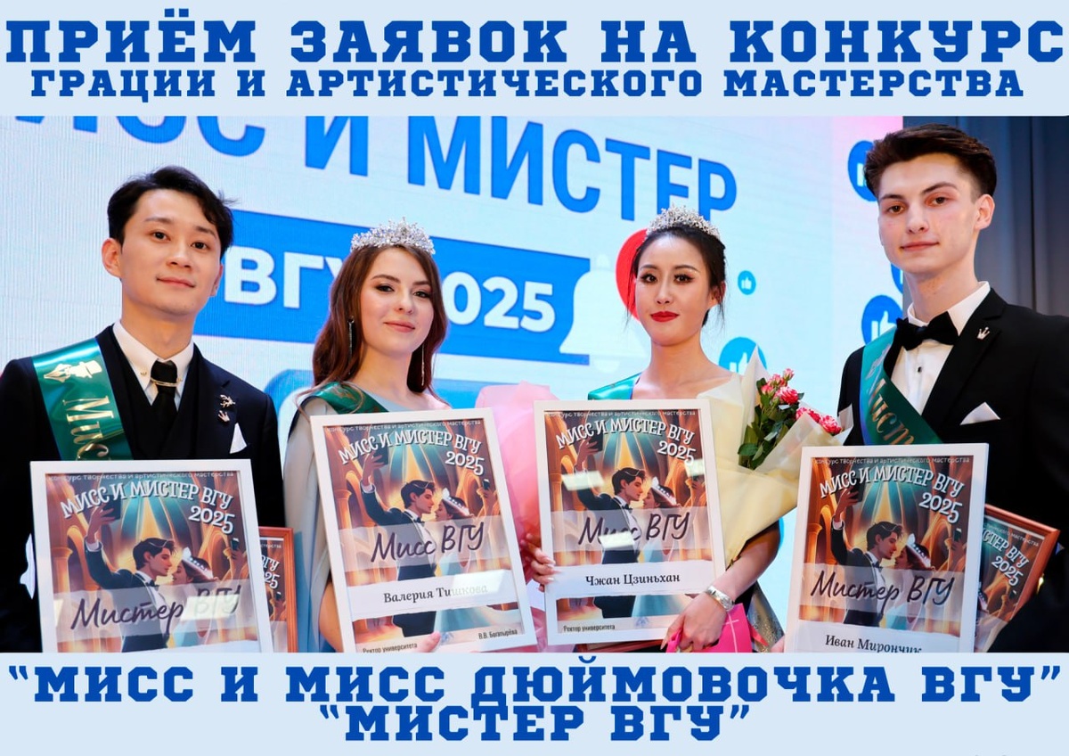 мастерства «Мисс и Мисс Дюймовочка ВГУ – 2026» и «Мистер ВГУ – 2026». Принимать участие могут студенты 1-5 курсов. Для участия приглашаются молодые люди в возрасте до 25 лет с эстетическими внешними данными, молодые девушки в возрасте 17-25 лет с эстетическими внешними данными, способные реализовать свой творческий потенциал, а также для раскрытия интеллектуальных и артистических способностей. ❗️Внимание! Прием заявок осуществляется до 22-го февраля (включительно) ➡️Подать заявку можно по ссылке на сайте университета #анонсы #ТворчествоВГУ
