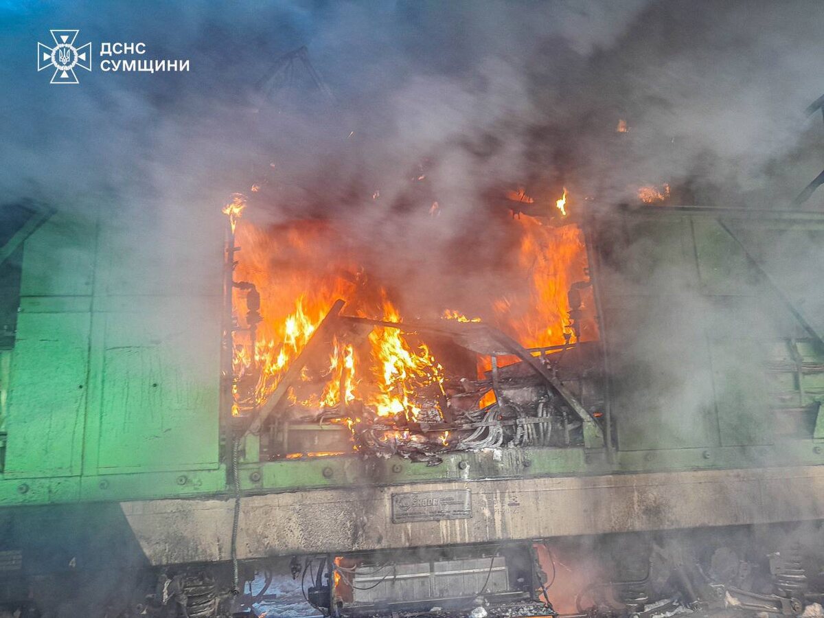 Тушение украинского локомотива, пораженного дроном в Конотопе Сумской области.