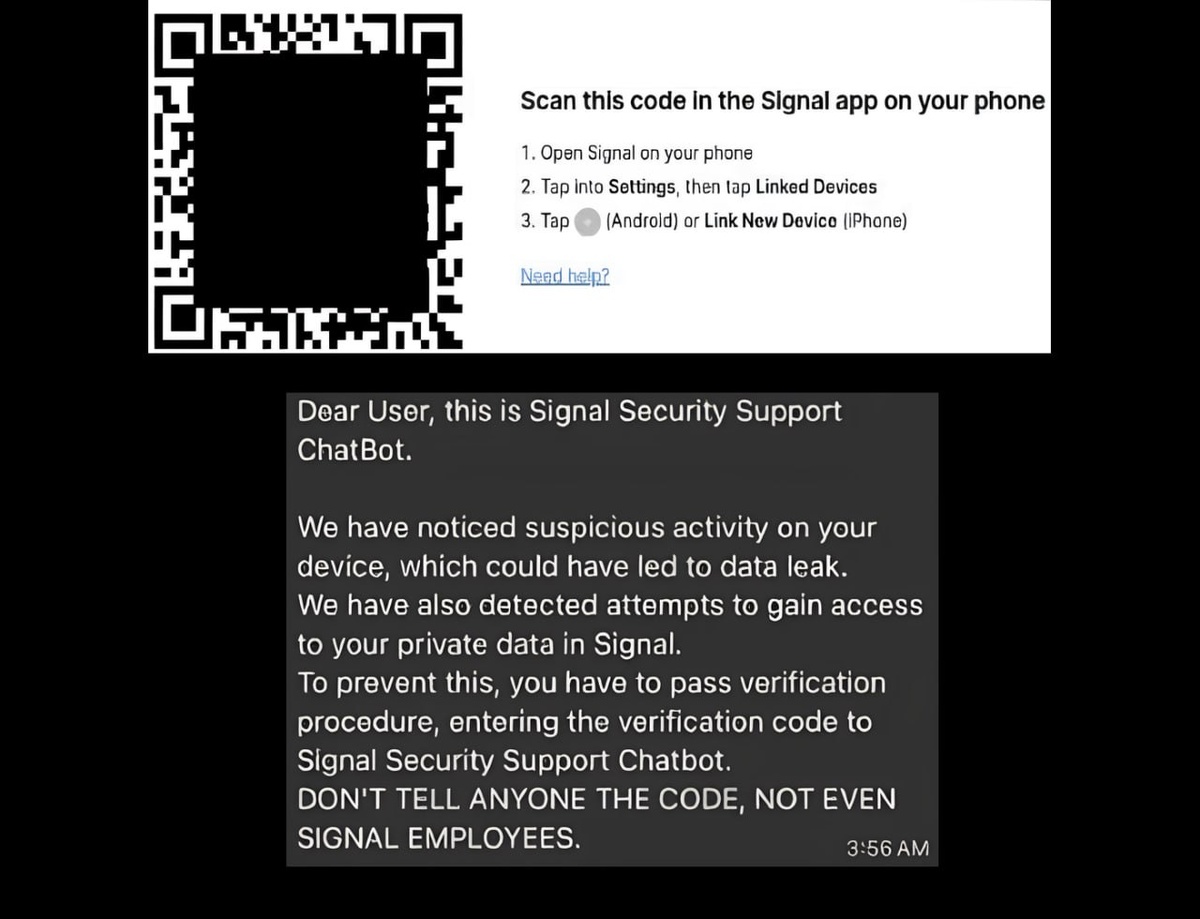 Апэтэшечка пытается перехватить доступ к Signal с помощью выманивания кодов и скана QR для привязки аккаунта к другому устройству. Давайте заглянем внутрь. Метод с QR интересный, если не считать того, что в трёх строчках есть грубая грамматическая ошибка, и инструкция неполная — техписы негодуют. С кодами похуже: текст пестрит такими ошибками, что даже средний европеец со слабеньким английским заподозрит неладное, а здесь речь как бы про высокопрофильные цели, которые с “B1, читаю со словарём” на работу не ходят. Плюс технически неграмотно — какие в Signal чат-боты с диар юзером? Да и уловка-22 с капслоком тоже совсем любительская. Лениво, господа, лениво. Если расчёт на “Из тысячи получателей найдётся один невнимательный идиот”, то ещё прокатит. А так, 3 из 10, в следующий раз делайте лучше. Гуглотранслейт хотя бы можно привлечь… @tomhunter