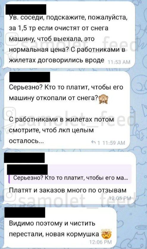 ". За 1500 рублей они любезно готовы откопать вашу машину от снега. Судя по отзывам, времени на очистку ЖК от снега у них попросту не остаётся. ________ Присылать новость @mstislavz 👉 Обсудить в чате ЖК 👉 Подписаться на канал 📲 Мы в MAX