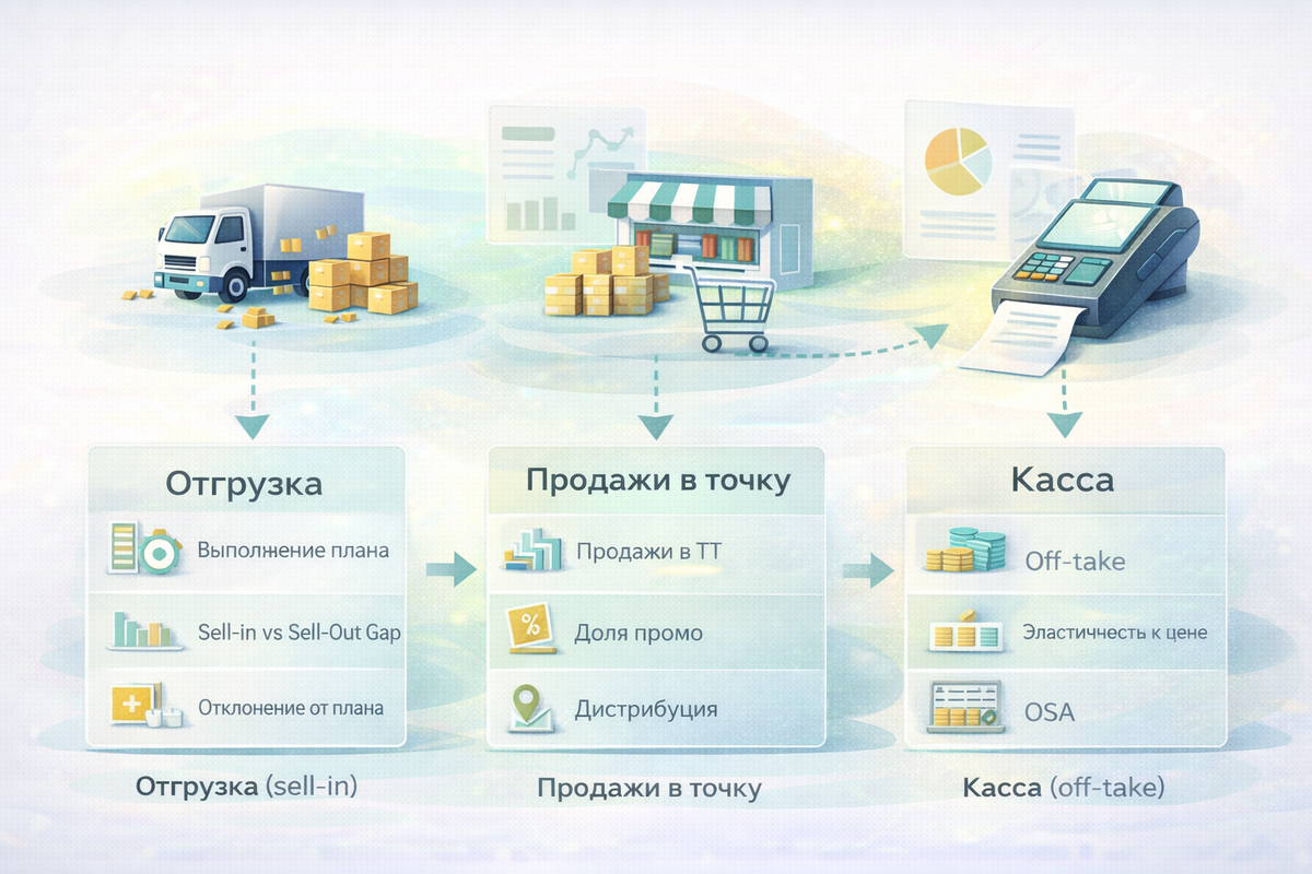 И дальше каждый приносит “свою” правду: Проблема не в том, что кто-то ошибается. Проблема в том, что это разные уровни одной цепочки, и если не договориться, какой KPI на каком уровне главный — вы будете бесконечно “сводить цифры” вместо управления. Ниже — практичная модель KPI “по цепочке”. Её можно использовать и при работе через дистрибьюторов, и при прямых продажах (просто меняется источник данных). 1) Золотое правило: KPI должны идти от “факта” к “причине” Если у вас падает касса, бессмысленно лечить её одной отгрузкой. Нужно смотреть вверх по цепочке: где именно “рвётся” поток — на отгрузке, на продаже в точки, на полке или на цене/промо. Классическая цепочка выглядит так: Отгрузка (sell-in) → Продажи в торговые точки (sell-out) → Касса (off-take) → Полка/наличие (OSA) → Запасы/возвраты Не все элементы всегда доступны (например, off-take). Но даже без «кассы» можно управлять, если правильно построить KPI на первых эта