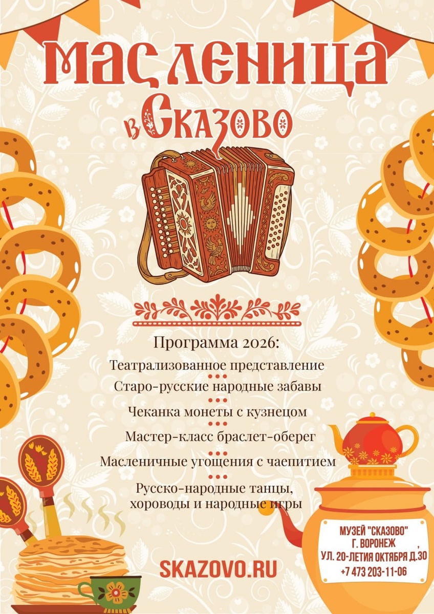 ) ☀️ 🔹 Программа 2026г. (Рекомендованный возраст с 6 до 99 лет) - Театрализованное представление: встретим праздник так, как отмечали его в древней Руси. - Старо-русские народные забавы - Чеканка монеты с кузнецом - Мастер-класс: изготовление старинного оберега - Масленичные угощения с чаепитием - Русско-народные танцы, хороводы и народные игры 🔸 Стоимость - 1800 рублей/участник 🔺Сопровождающие для детских (1-11 класс) групп Бесплатно 5+1, из расчёта на каждых 5 детей = 1 сопровождающий бесплатно. Бонус для учителей: классный руководитель и его ребёнок бесплатно (1 учитель и 1 ребёнок на всю группу) ✅ Во все билеты включено: - интерактивная программа 1 час 40 мин; - чеканка фирменной монеты; - изготовление оберега на мастер-классе; - чаепитие. Продолжительность программы = 1 час 40 минут Начало в 9:00, 11:10, 13:20, 15:30, 17:40 🚍 Возможен заказ сертифицированного транспорта (по Воронежу от 300 руб./чел). (!) Участникам профсоюза скидка 7% по промокоду "10086" (без кавычек